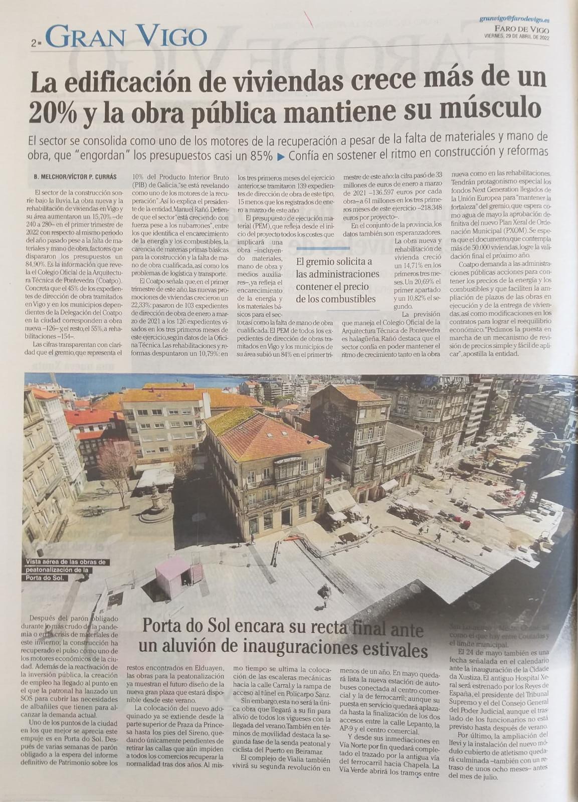 29/04/22: La Voz de Galicia. La construcción crece un 16% en Vigo pese a la carestía de materiales