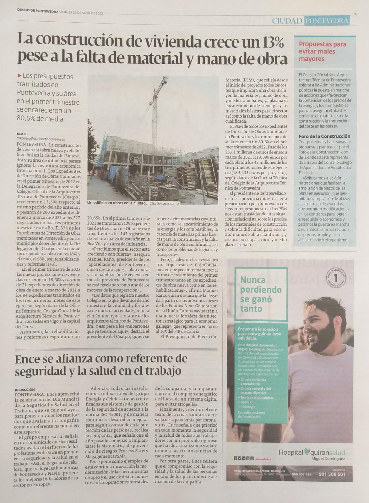 29/04/22: La Voz de Galicia. La construcción de vivienda creció un 13,5% en Pontevedra en lo que va de año