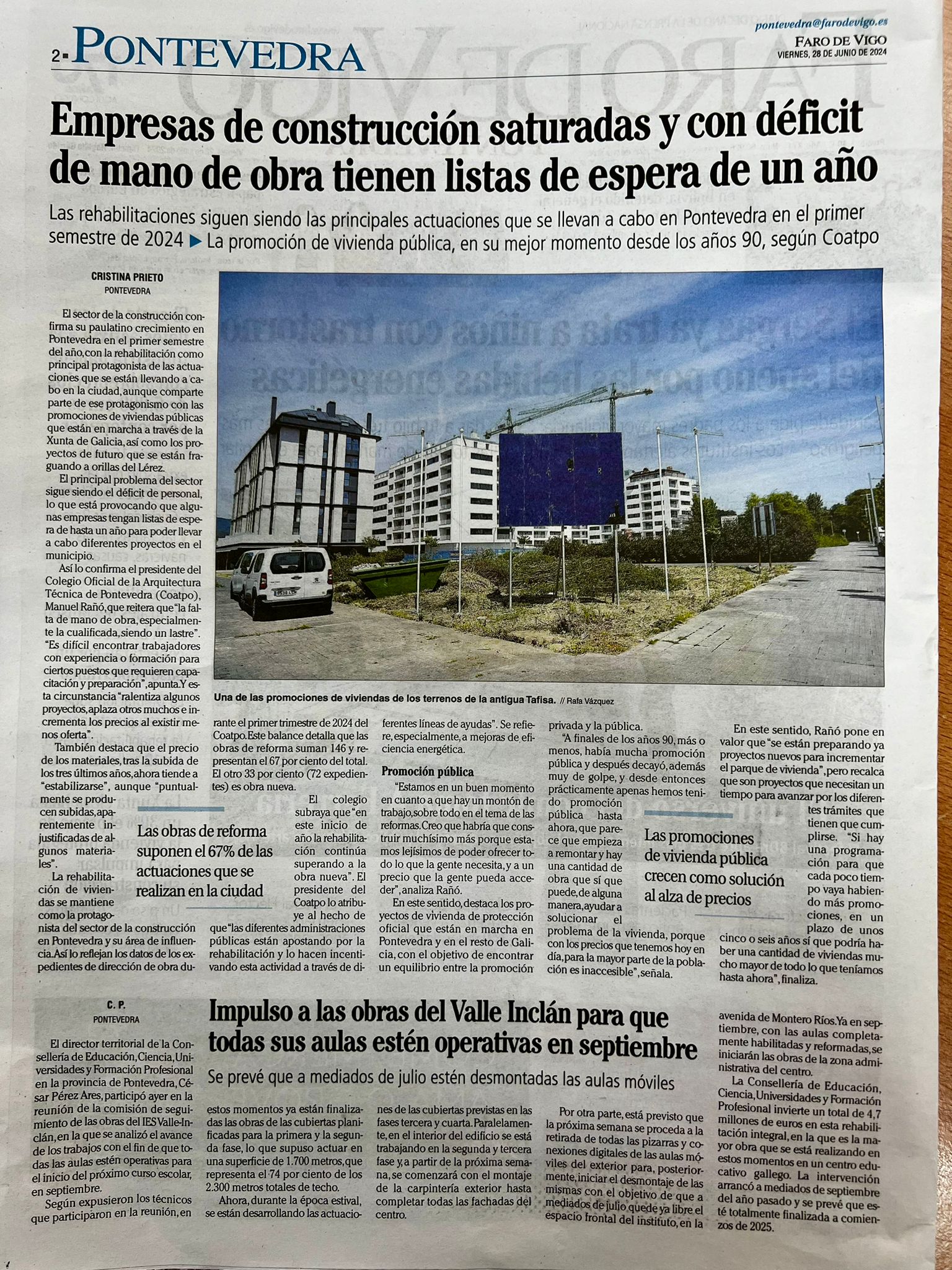 28/06/2024: Faro de Vigo. Empresas de construcción saturadas y con déficit de mano de obra tienen listas de espera de un año