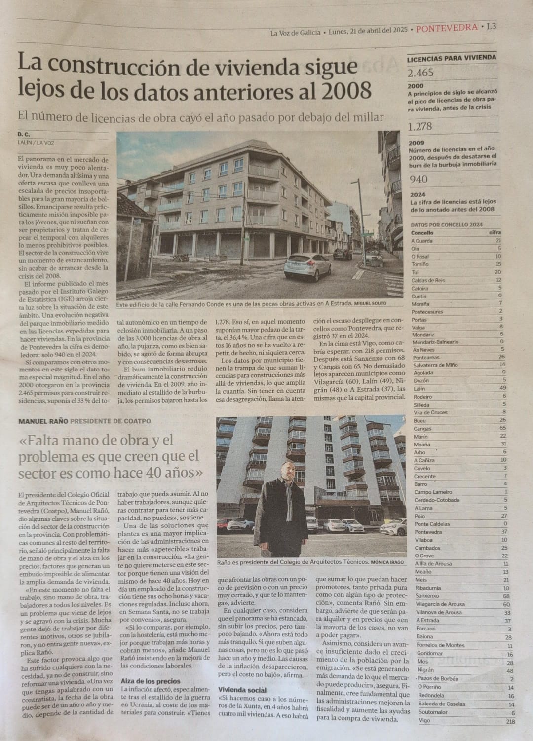 30/07/2024: La Voz de Galicia. Manuel Rañó Presidente de los Arquitectos Técnicos de Pontevedra: "el principal escollo sigue siendo la falta de mano de obra"